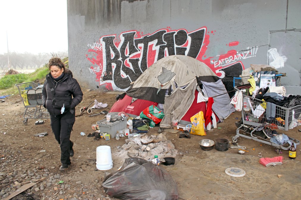 Over the loud roar of Highway 99 traffic, Gloria Arroyo approached the oleanders lining the west side of the freeway Thursday morning in search of homeless persons only to be startled by the sound of a dog barking. The substance abuse case manager strained to see then dog and a homeless man moving inside a thick nest inside the bushes where he spent the night.