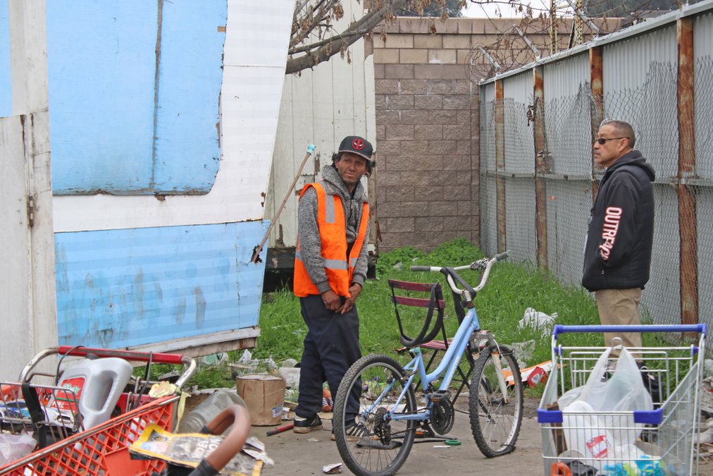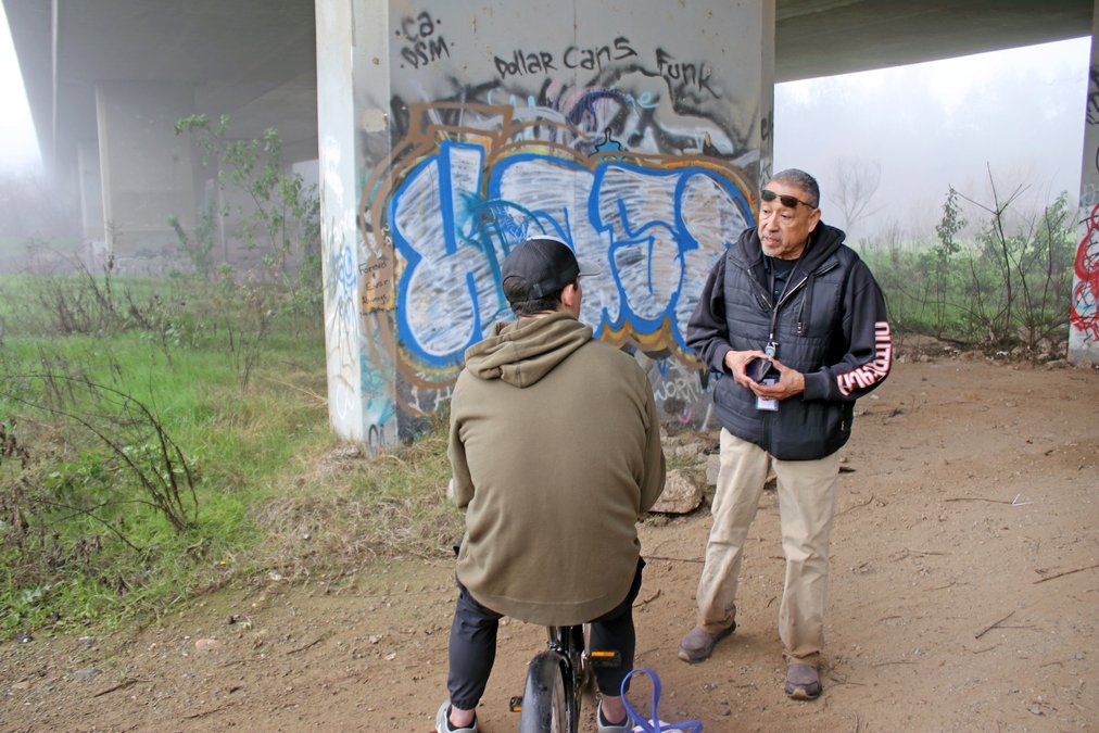 Under the Mitchell Road bridge, Ascencio found a young man on a bicycle who agreed to be answer questions. He explained that he came to California from his native New York after serving eight years in the military where he saw combat action. He is homeless due to a drug problem but agreed to have Ascencio reach out to connect him this week with housing options.