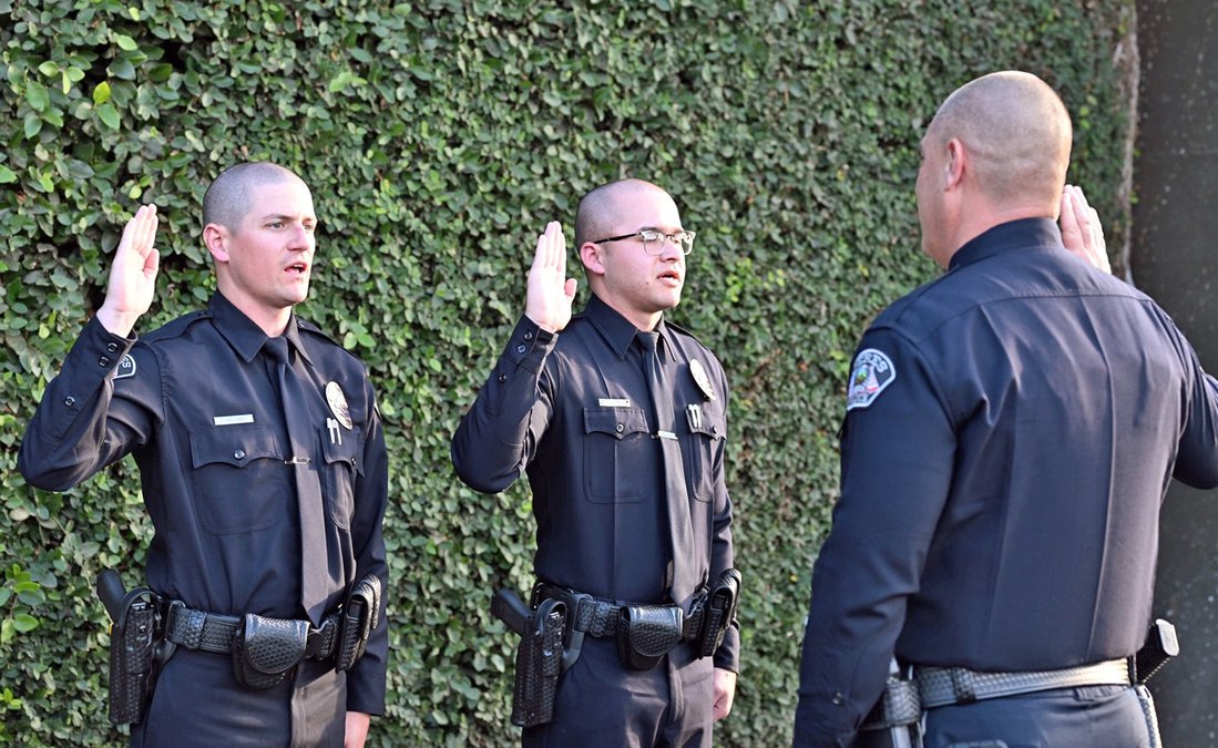 The police leadership team and other employees of Ceres Police attended the Friday, Feb. 6 graduation of two cadets who completed the Stanislaus Regional Law Enforcement Academy. From there Chase Maloney and Romy McClain were sworn in as officers as they moved into a time of field training.