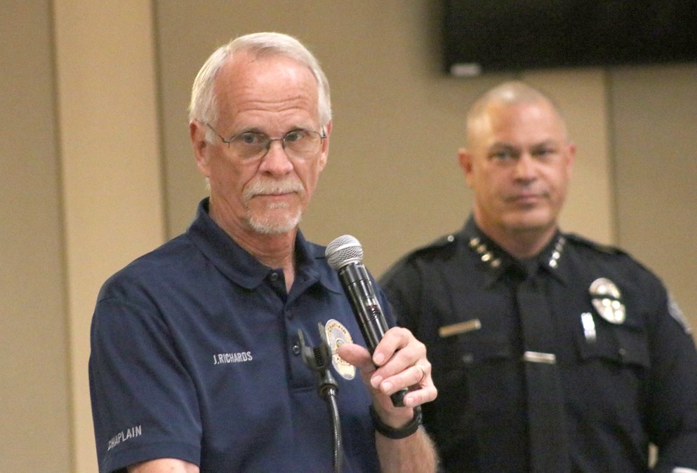 Police Chaplain Joel Richards started on a somber note when noted that morning that Tulare County Sheriff’s Detective Randy Hoppert was shot and killed in Porterville. After calling for a moment of silence Richards prayed for the family and the safety of all officers. The officers present at the ceremony had a black band over their police badges.